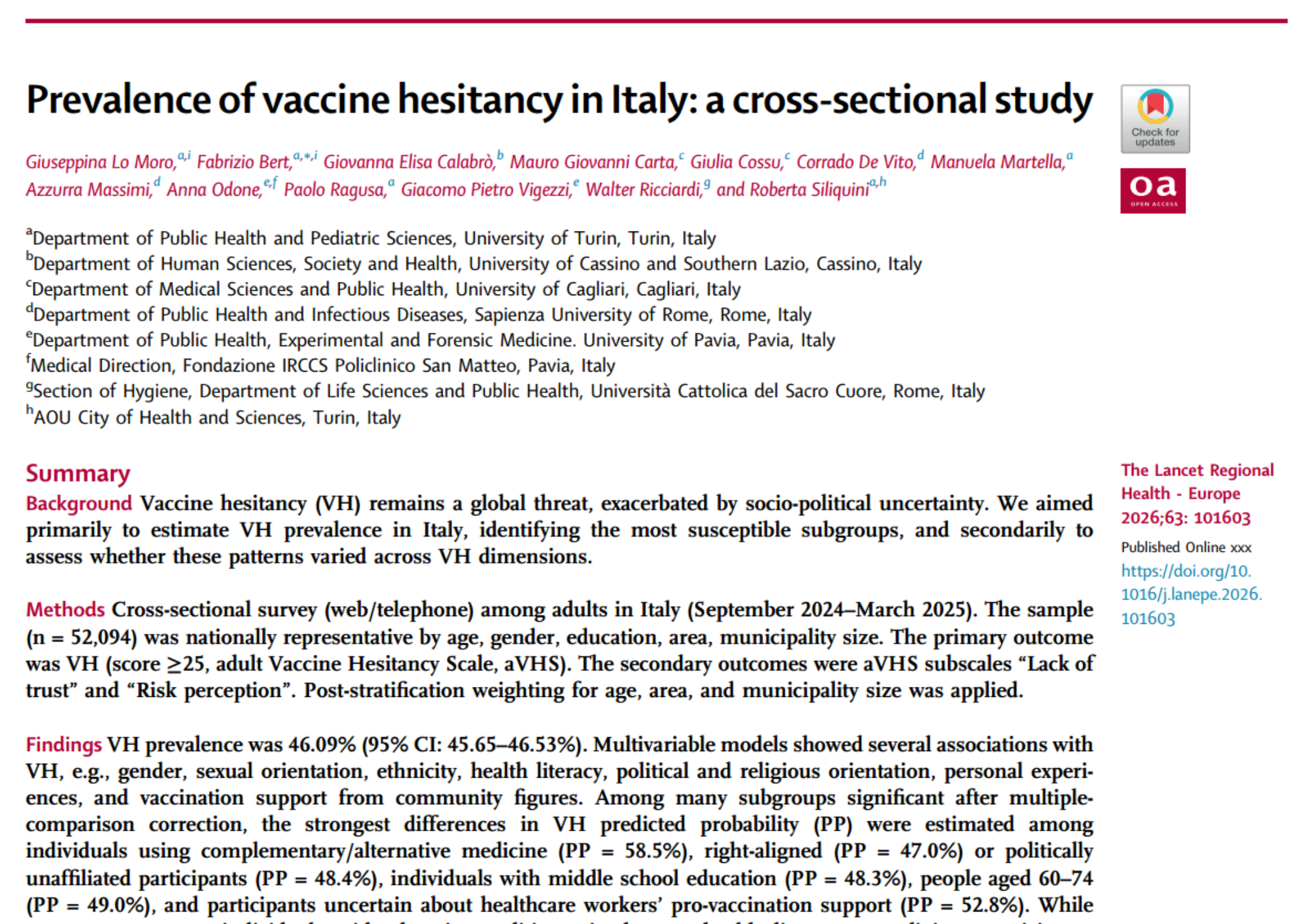 L’esitazione vaccinale rimane un problema di notevole rilevanza per la salute pubblica a livello mondiale. Su tali basi è stato condotto lo studio dal titolo “Prevalence of vaccine hesitancy in Italy: a cross-sectional study” con l’obiettivo primario di stimare la prevalenza dell’esitazione vaccinale nella popolazione adulta in Italia, identificando i sottogruppi di soggetti più suscettibili.